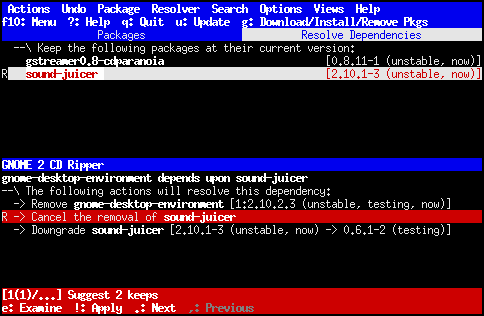 Na předchozím obrázku je uprostřed obrazovky zobrazen krátký popis balíku sound-juicer. Pod ním je vidět závislost, která způsobila podržení balíku sound-juicer v aktuální verzi (gnome-desktop-environment závisí na sound-juicer). Dále pak následuje seznam možností, jak tuto závislost vyřešit.